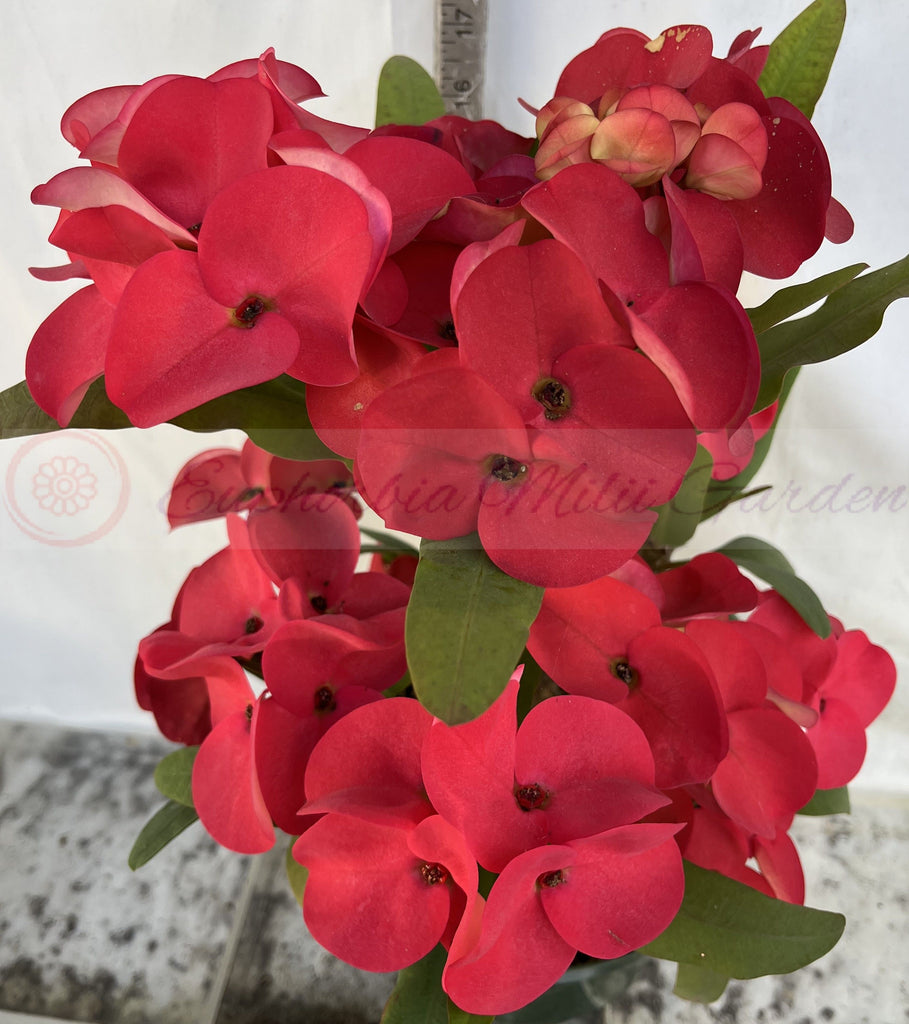Crown of Thorns "Hwan Chai" is a distinguished premium hybrid known for its impressive features. It boasts gigantic, oval-shaped red bracts that exhibit a unique cup form. This remarkable plant demonstrates a strong branching habit, with numerous clusters of blossoms that enjoy a prolonged blooming period, enhancing its ornamental appeal.