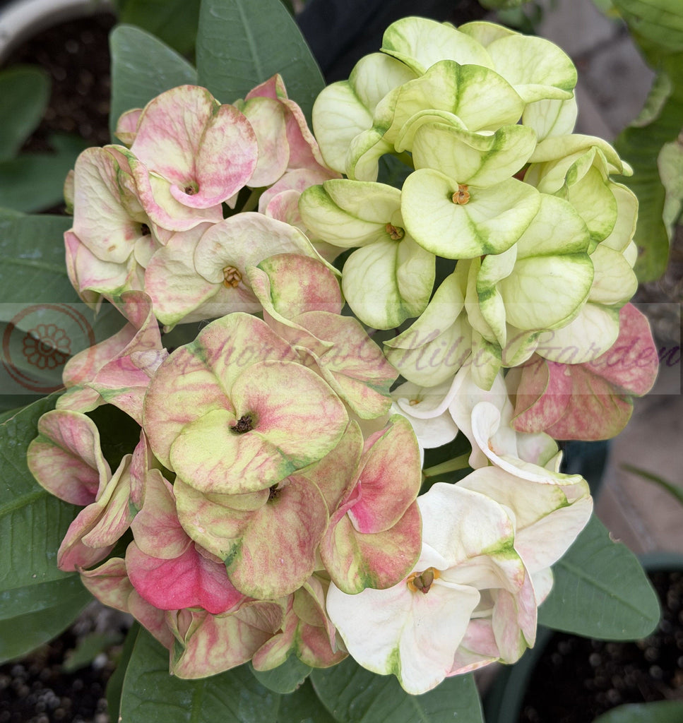 Crown of Thorns "The Great Divide" (or "Phet Udom") represents a premium-quality hybrid meticulously developed at Ek Udom Garden. This remarkable cultivar initially showcases milky white flowers complemented by distinctive green highlights. As the season transitions into winter, the blossoms elegantly take on a pink hue.