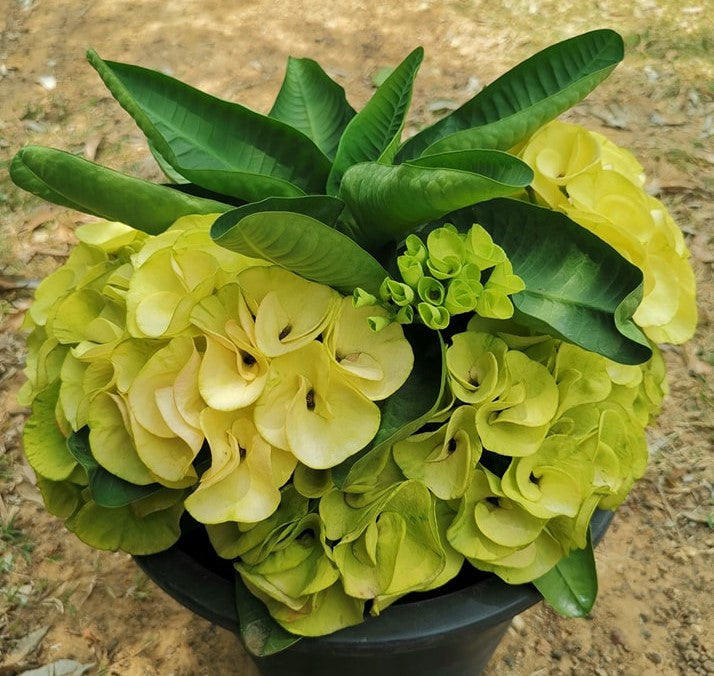 Euphorbia milii "Golden Jade" es un cultivar distinguido, reconocido por su calidad superior. Esta excepcional planta presenta flores grandes, gruesas y ahuecadas en llamativos tonos amarillo verdosos, que a menudo contienen hasta 32 flores por tallo. Su follaje es igualmente impresionante, caracterizado por hojas gruesas y texturizadas, bellamente redondeadas y de un color verde intenso. Gracias a sus extraordinarias características, este cultivar ha sido galardonado en concursos florales en Tailandia, un país reconocido por su extraordinaria diversidad floral.