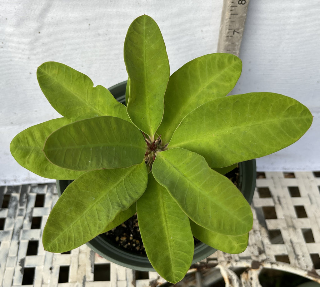 Crown Of Thorns PAPERINA is an exquisite white-blooming cultivar distinguished by its seasonal appeal. The plant features notably thick, flat, and exceptionally large bracts, which, subject to seasonal variations, may display delicate pink or green streaks and splashes. These unique visual elements contribute to the plant’s overall depth and intrigue. Of particular note is the winter presentation, during which the bracts attain a pristine, milky white coloration reminiscent of a full moon, further enhancing its exceptional beauty.
