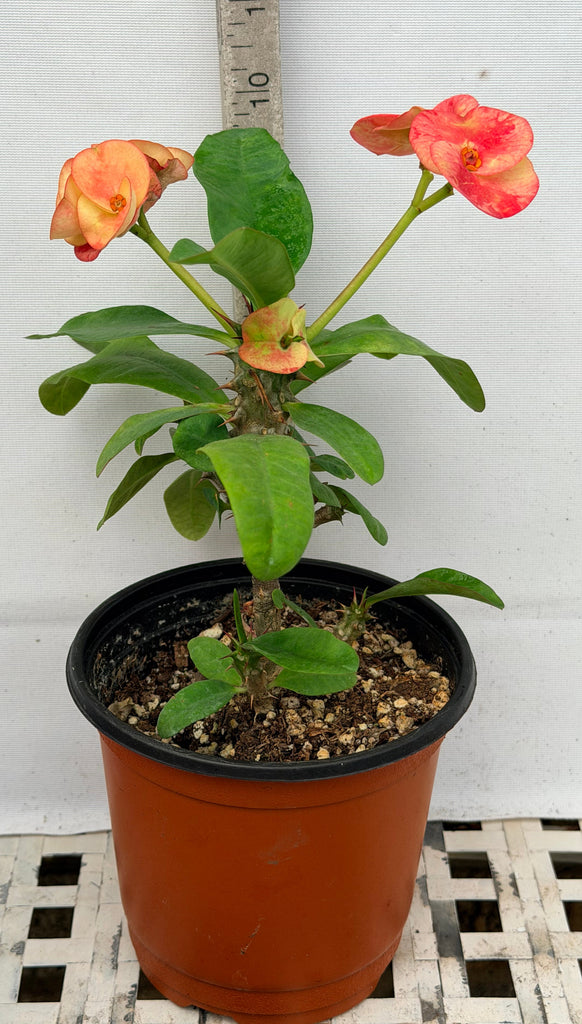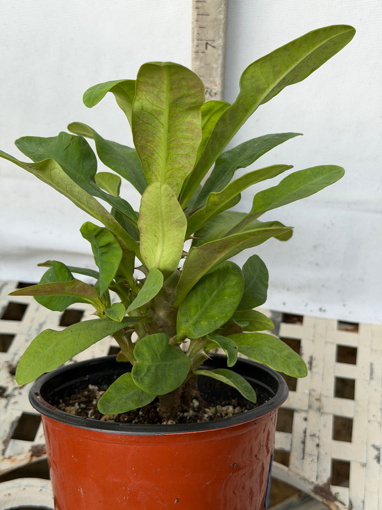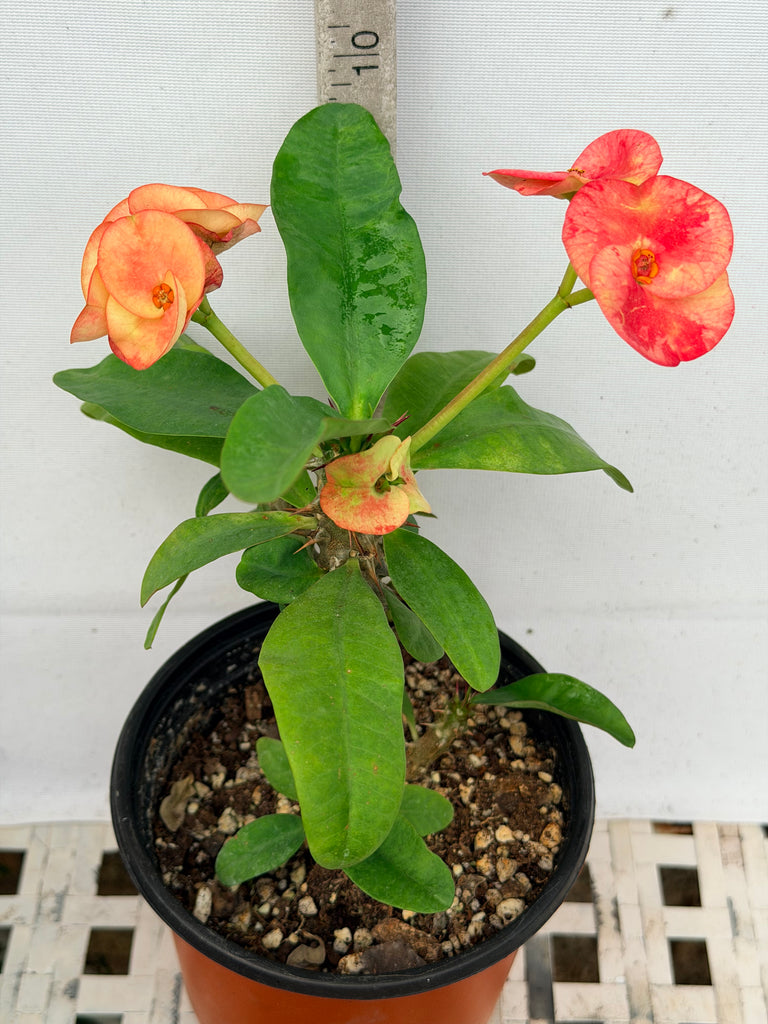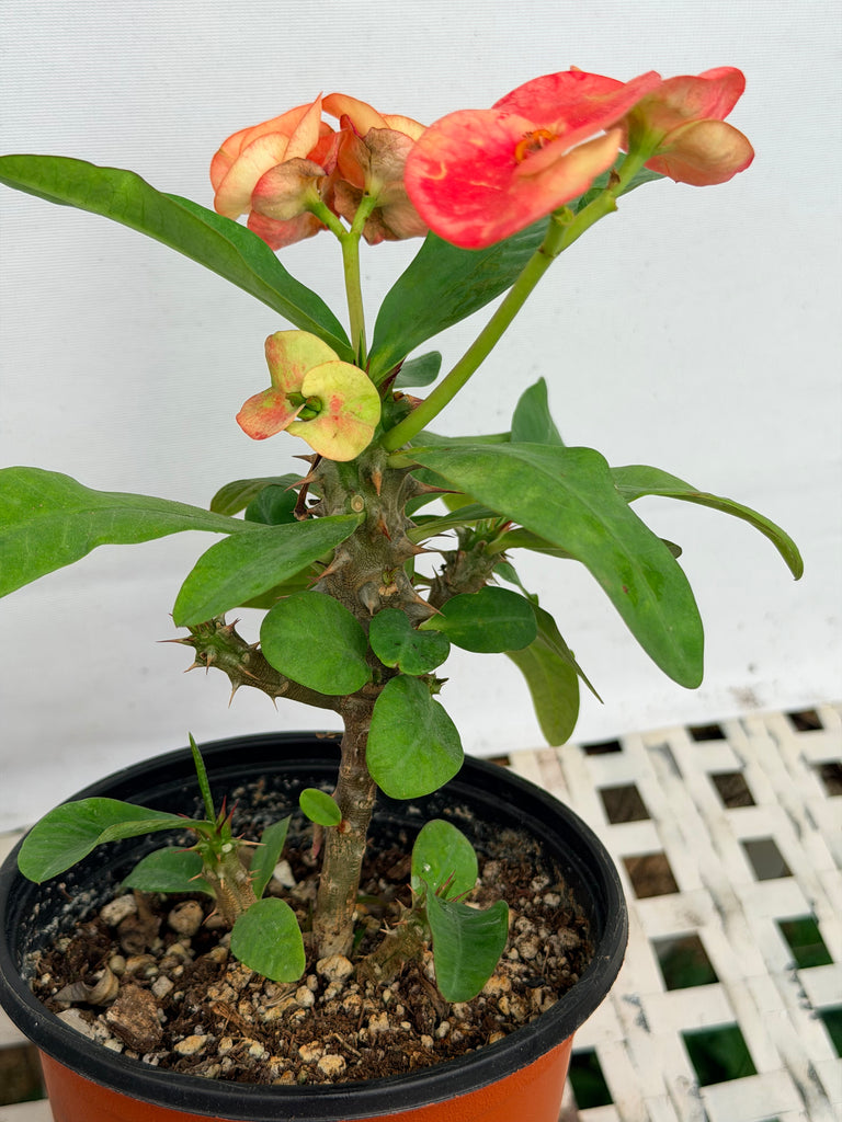 A stunning addition to your garden, "Blance" cultivar is a remarkable gem within the Crown of Thorns family, celebrated for its unique attributes and beauty. This plant features a moderate growth rate and a compact form. Renowned for its heavily branched and clumping nature, "Blance" is particularly valued for its ability to produce abundant and continuous blooms throughout the growing season. Despite its small leaves, the flowers are impressively large and eye-catching.