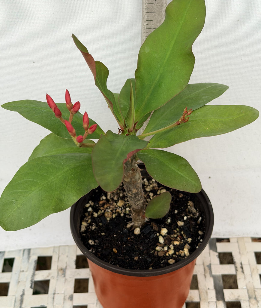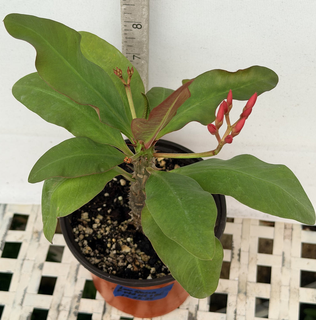 Euphorbia milii "Lavender Queen" is a stunning and resilient flowering plant known for its exceptional branching habit and continuous bloom cycle. Unlike many traditional Crown of Thorns (COT) varieties that feature tightly clustered, ball-like flowers, "Lavender Queen" showcases lavish, loosely scattered blooms atop its sturdy stalks. This unique flowering style enhances its charm in any garden or indoor space. The bracts of the Lavender Queen come in a beautiful pink-lavender shade, softly flushed with white, making it an eye-catching addition to your collection. Perfect for gardeners looking to add vibrancy and color, Euphorbia milii "Lavender Queen" is an ideal choice for both experienced and novice Crown of Thorns enthusiasts. Enhance your collection with this remarkable variety that offers beauty and elegance year-round!