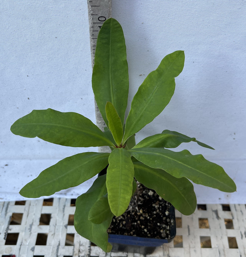 Euphorbia milii 'Orange Pom Pom,' known for its stunning and substantial orange blooms. This captivating variety of Crown of Thorns exhibits a fascinating range of color tones throughout the seasons. Depending on the time of year, the flowers can transition from vibrant orange to pink-orange and may even deepen to a rich red hue. Each stalk is capable of supporting up to 16 flowers arranged in an aesthetically pleasing hydrangea-style cluster. During the winter months, the plant's color palette shifts to include shades of pink and light red, while the summer brings forth a brilliant orange display.