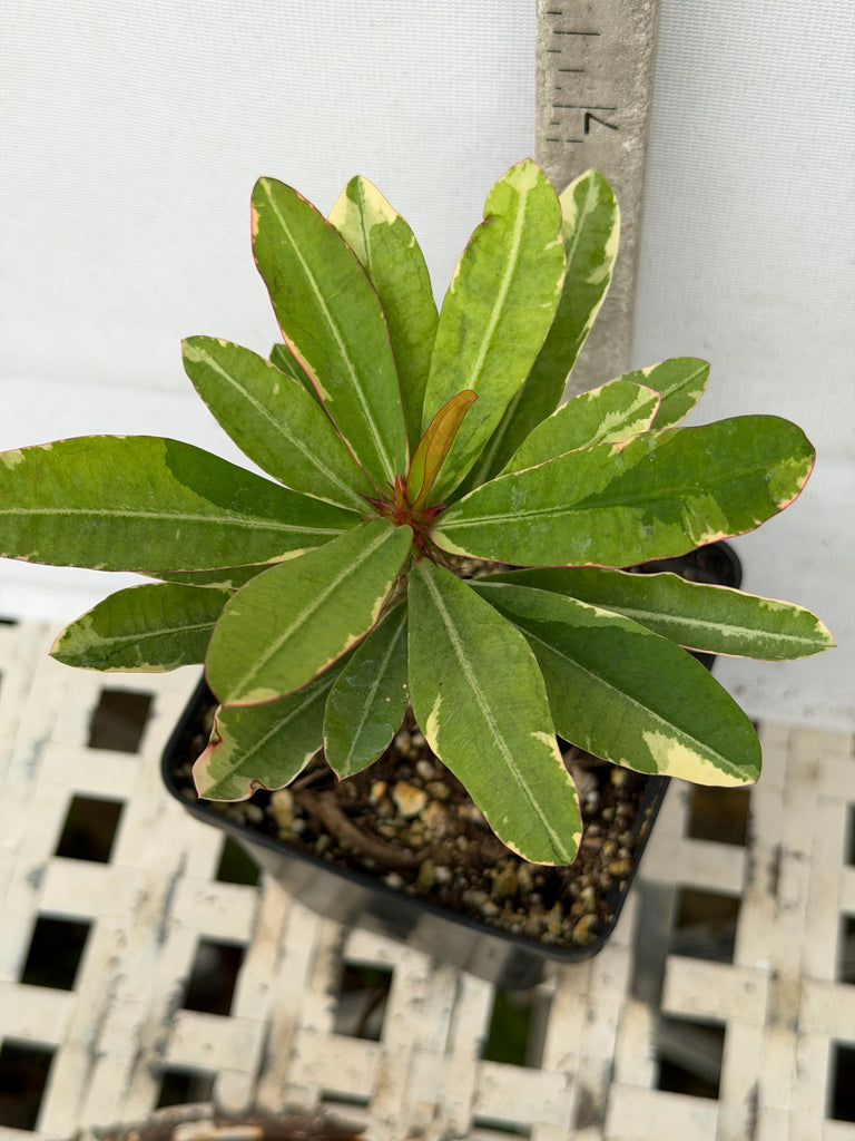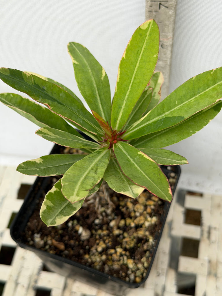 Pink Charm stands out as a premier selection among Crown of Thorns collectors, recognized for its exquisite variegated foliage that exhibits a stunning tricolor blend of white, green, and pink. In contrast to the "Red Fertile" cultivar, which also showcases variegation, "Pink Charm" offers a distinctive double-hue variegation when exposed to bright light. Under such conditions, the off-white variegation transforms into a subtle pink shade, further elevating its aesthetic appeal.